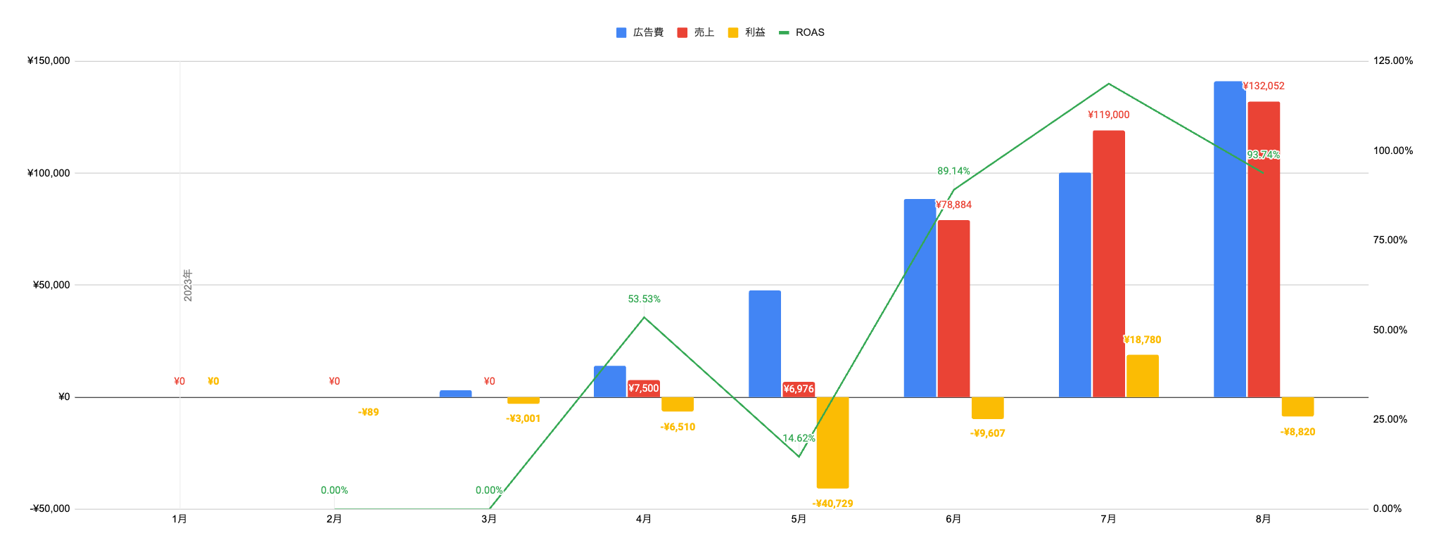 以下のグラフは、青が広告費、赤が売上、黄色が利益です。(緑はROASという利益率のような指標)