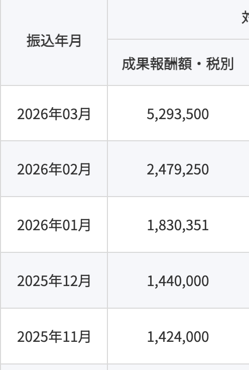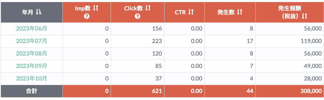 以下は一部ASPの管理画面、売り上げのスクリーンショットになります。
